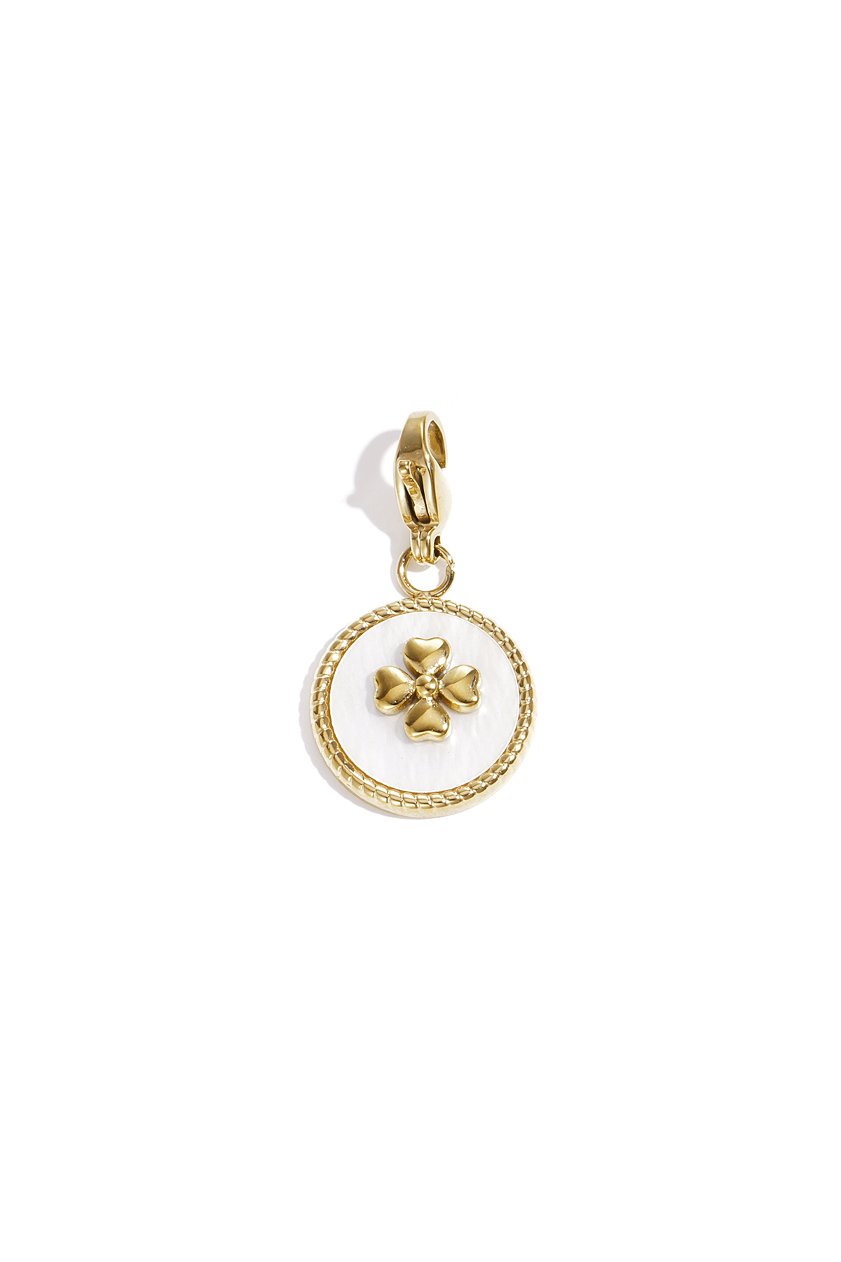 Geef je sieraden of bikini een unieke en trendy uitstraling met deze stijlvolle clover coin charm. Deze bedel met klavertje vier design staat symbool voor geluk en voegt een speelse, luxe touch toe aan elke look.