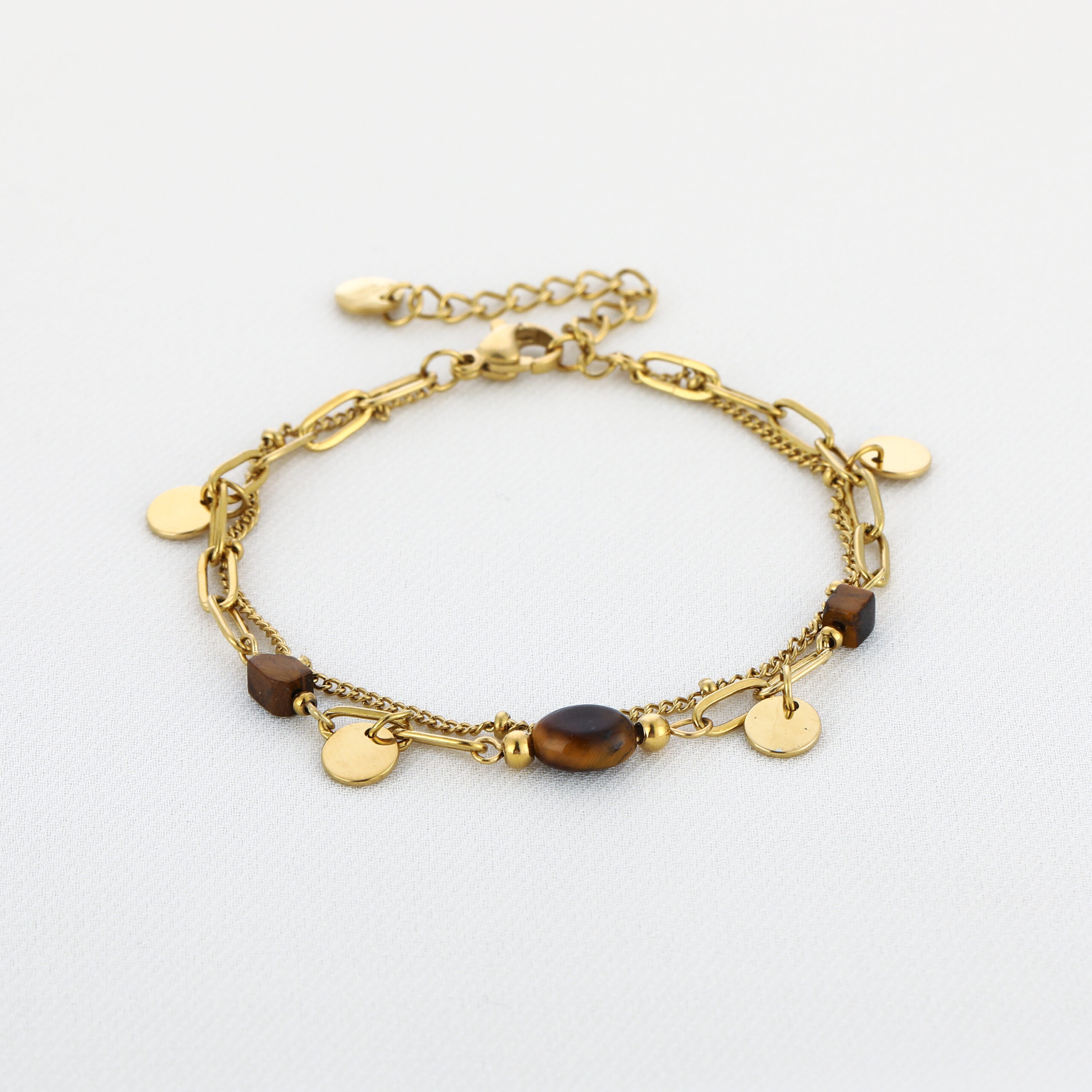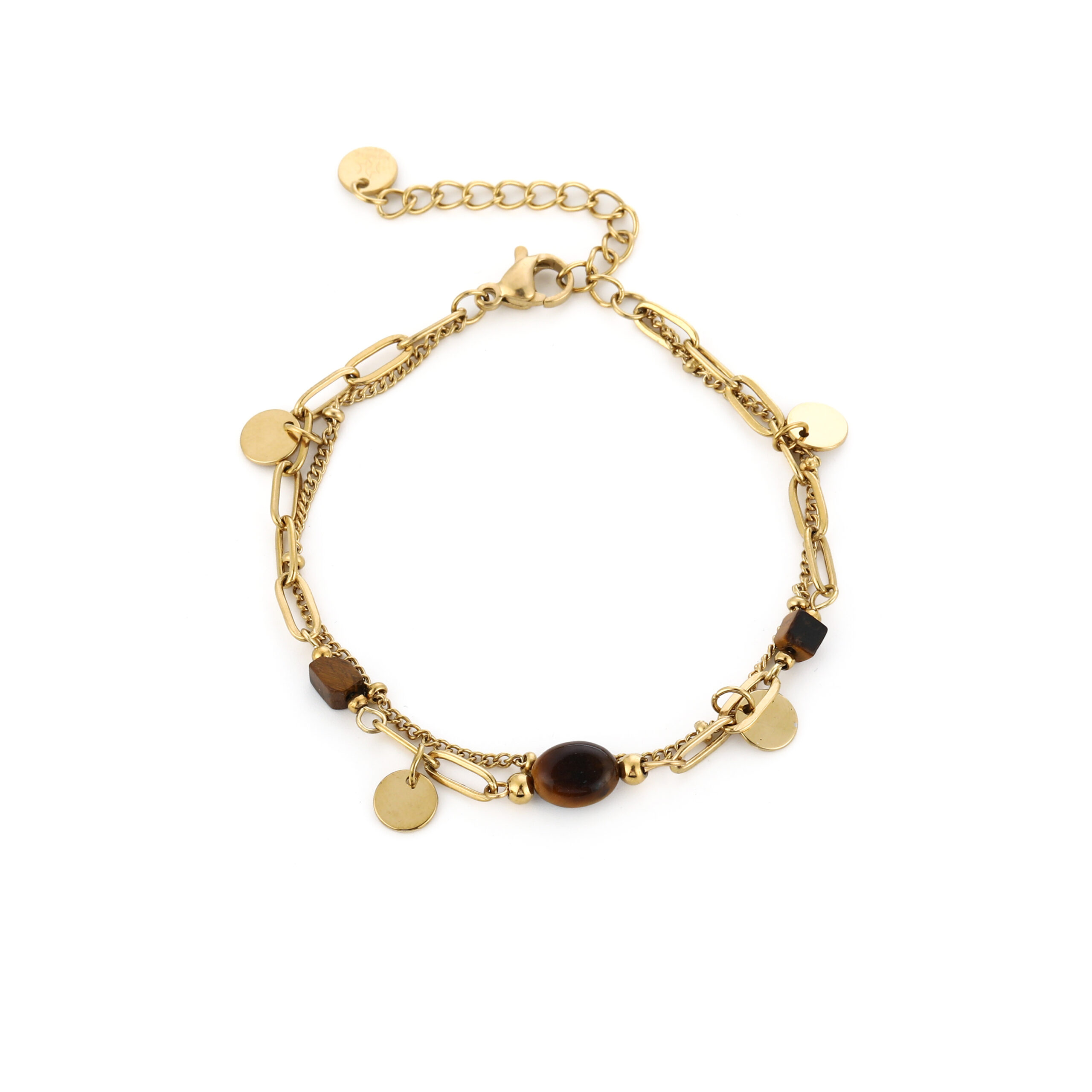 Tiger Stone armband bruin met goudkleurige stainless steel bedel